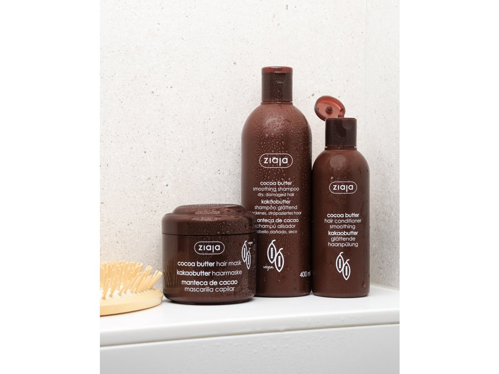 Vyhlazující maska na vlasy s kakaovým máslem pro vlasy suché nebo poškozené bez lesku. Kakaové máslo je výtažek stromu Theobroma - kakaovníku, obsahuje antioxidanty, minerální sole, mastné kyseliny. Zabraňuje nadměrnému vysušování a zlepšuje zbarvení. Dokonale vyhlazuje narušenou strukturu vlasu, Hloubkově regeneruje bez zbytečného zatížení, zabraňuje lámání vlasů a třepení konečků. Zaručuje vlasům přirozený a zdravý vzhled a dlouhotrvající péči. Neobsahuje parabeny.