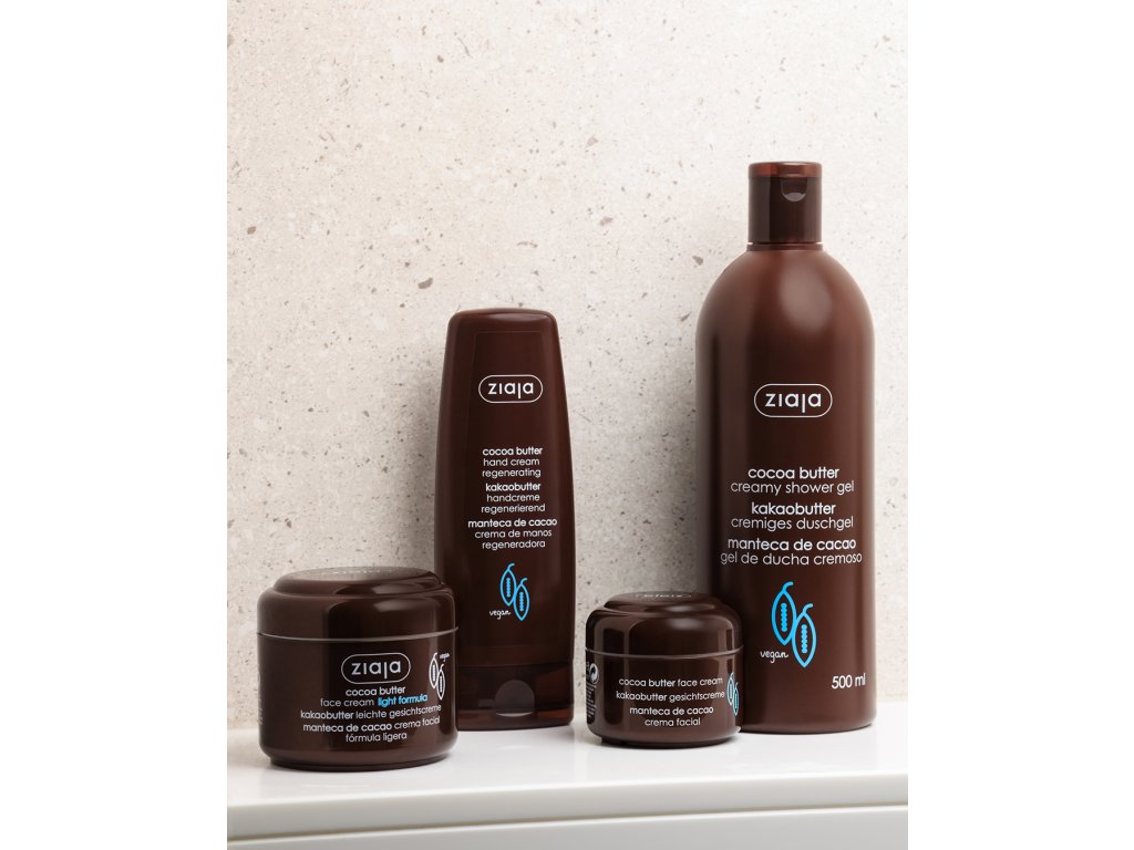 Regenerační krém na ruce s kakaovým máslem a olejem canola. Kakaové máslo je výtažek stromu Theobroma - kakaovníku, obsahuje antioxidanty, minerální sole, mastné kyseliny. Zabraňuje nadměrnému vysušování pokožky a zlepšuje zbarvení pleti. Olej canola je bohatý na fytosteroly a tokoferoly, vyživuje a zvláčňuje pokožku. Má přirozený systém antioxidace, neutralizuje volné radikály, chrání před škodlivými účinky UV záření a účinně zmírňuje podráždění. Krém na ruce důkladně regeneruje lipo strukturu svrchní pokožky, zjemňuje a vyhlazuje pokožku dlaní. Zpevňuje nehty a chrání je před třepením a lámáním. Je určený pro každodenní péči o pokožku rukou, která je vystavena častému kontaktu s pracími prostředky, poškozena nadměrným opalováním i v soláriích, citlivou na změny počasí nebo mráz.