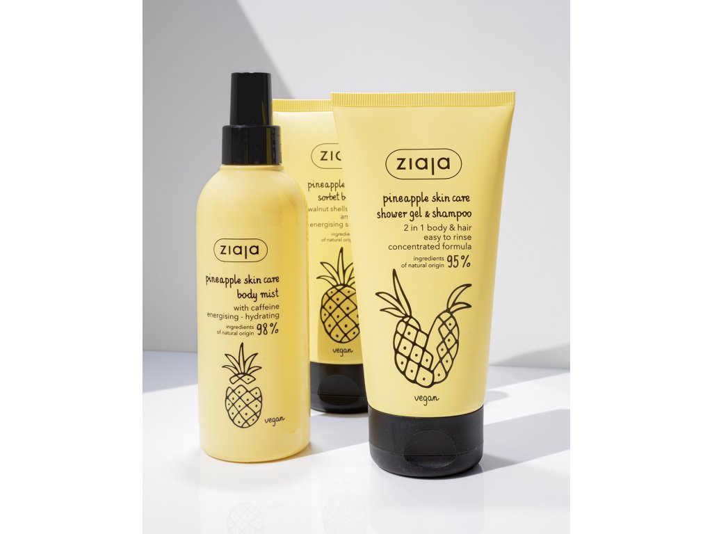 Ananasová energetizující hydratační mlhovina na tělo s kofeinem. Mlhovina na tělo s explozí svěžesti a hydratace. Rychle a efektivně pečuje o pokožku. Obohacená o kofein a extrakt z ananasu poskytuje expresní revitalizaci. Extrakt z ananasu a aktivní kofein jsou kosmetickým povzbuzením pro pokožku. Šťavnatá vůně exotického ananasu a fascinující receptura produktů zaručují intenzivní, radostnou a osvěžující péči.