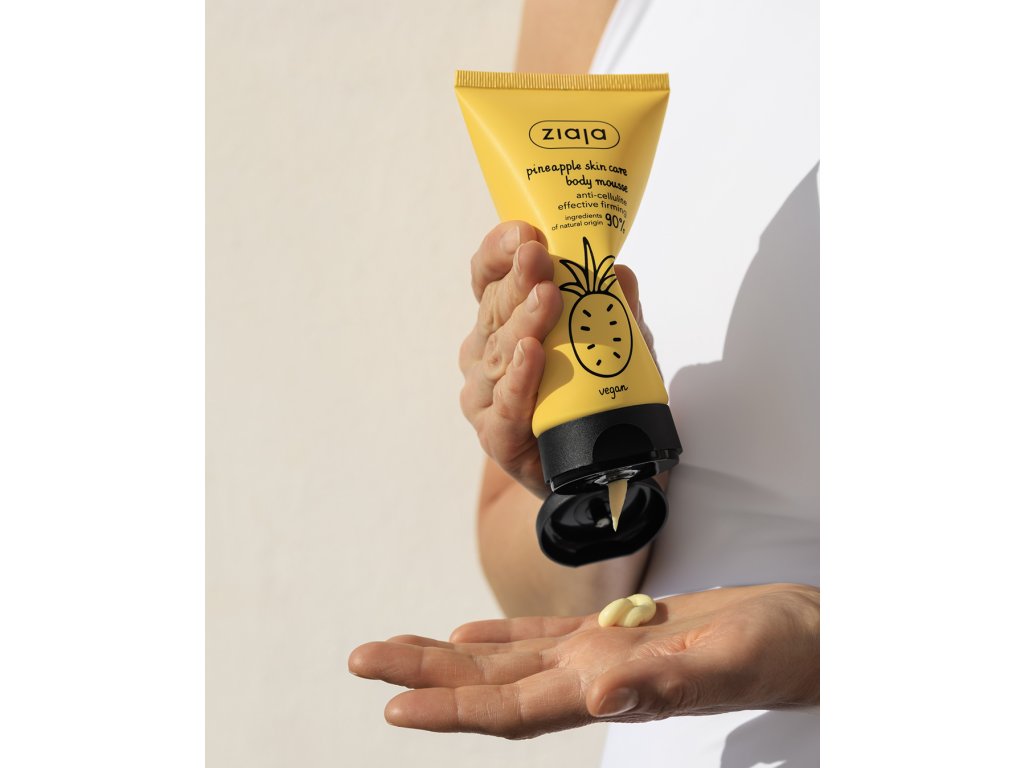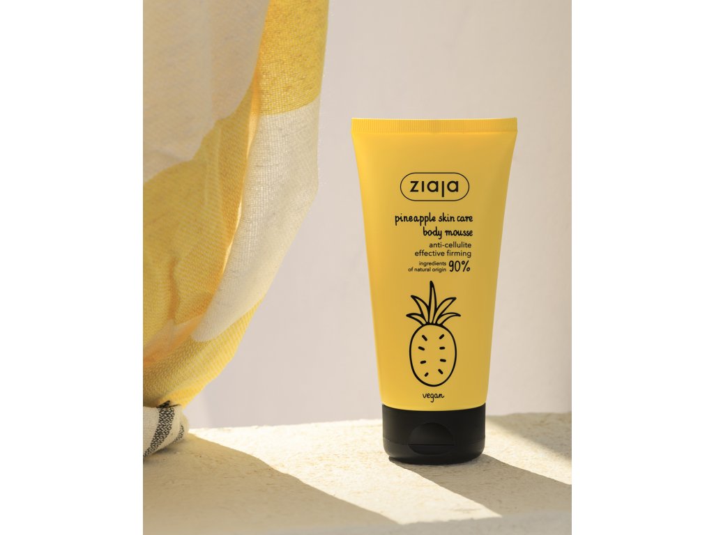 Lehká tělová pěna se stimulační aktivní recepturou bohatou na anticelulitidní extrakt z ananasu a povzbuzující kofein. Extrakt z ananasu (Pinneapple) zlepšuje hladkost, pružnost a pevnost pokožky s celulitidou. Aktivní kofein mobilizuje pokožku pro zlepšení její pevnosti. Posiluje a vyhlazuje strukturu epidermis. Lehká ananasová tělová pěna má vysokou účinnost zpevnění pokožky, zlepšuje pružnost a celkový stav pokožky. Pečuje o pokožku a dodává jí kosmetický doping. Vyhlazuje, zpevňuje a zvlhčuje pokožku. Povzbuzuje a má svěží exotickou vůni.